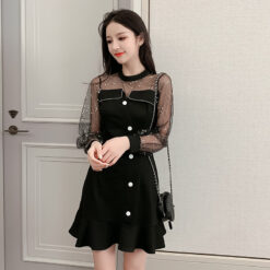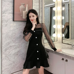 มินิเดรสสีดำเซ็กซี่ แขนยาว ช่วงไหล่ และแขนเป็นผ้าซีทรู ช่วงบนลำตัวเข้ารูป ด้านหน้าแต่งกระดุมหลอก ชายกระโปรงจับจีบ