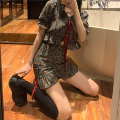 ชุดเชตลายเดียว เสื้อครอป คอวี กระดุมหน้า มีสายผูกแต่งโบว์ ชายเสื้อระบาย พร้อมกระโปรงทรงเอชายระบาย มีเชือกแต่งแต่งด้านข้าวกระโปรง