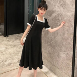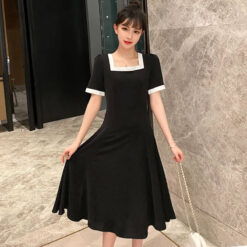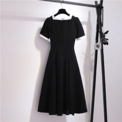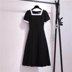 เดรสดำ คอเหลี่ยม แต่งชุดด้วยขอบสีขาวตัดบริเวณขอบรอบคอ และรอบแขน ตัวกระโปรงเป็นแบบบาน ๆ ปล่อย