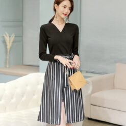 เดรสคอวี แขนยาวสีดำ ช่วงเอวมีสายผูก กระโปรงยาวแต่งซ้อนสองชั้นแหวกหน้าลายทางตรงสีขาวดำ เนือผ้าหนาใส่สบาย